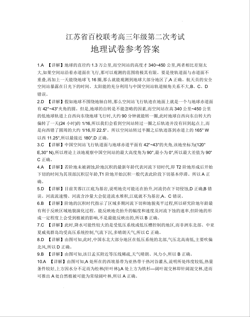 2024届江苏省百校大联考高三上学期第二次模拟预测考试 地理答案