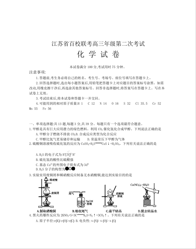 2024届江苏省百校大联考高三上学期第二次模拟预测考试 化学