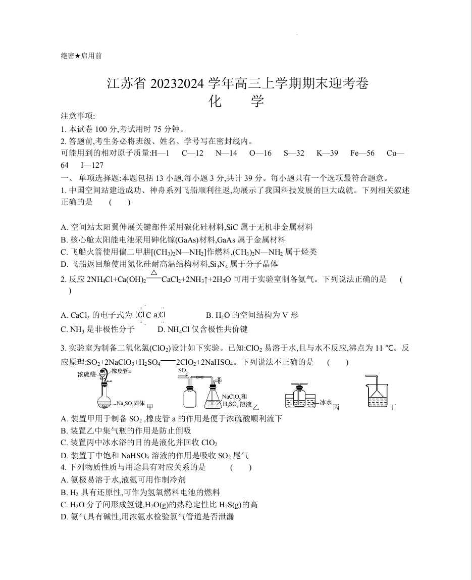 江苏省2023—2024学年高三上学期期末迎考卷 化学