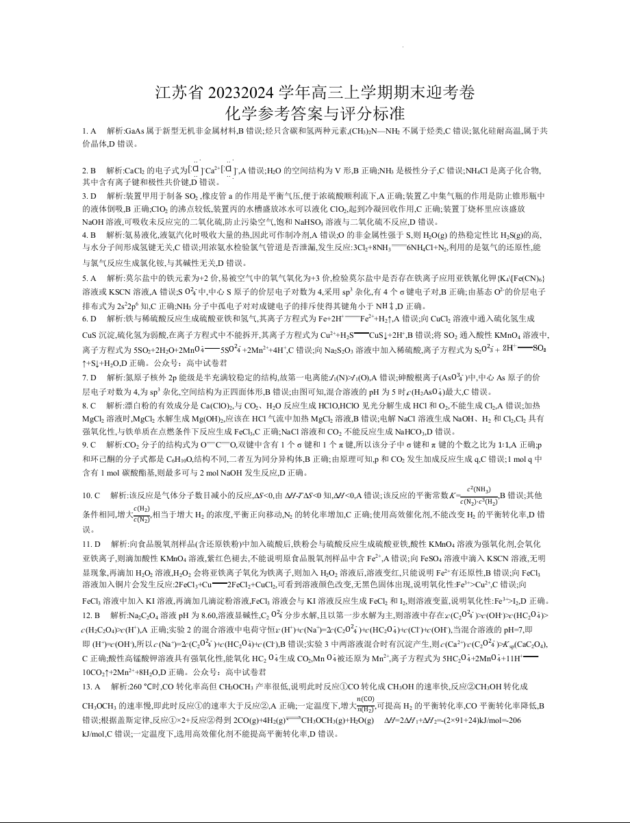 江苏省2023—2024学年高三上学期期末迎考卷 化学答案