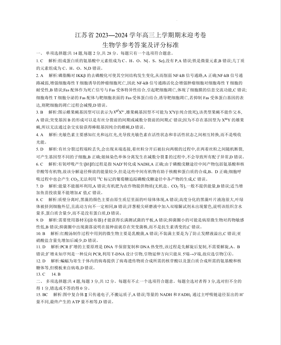 江苏省2023—2024学年高三上学期期末迎考卷 生物答案