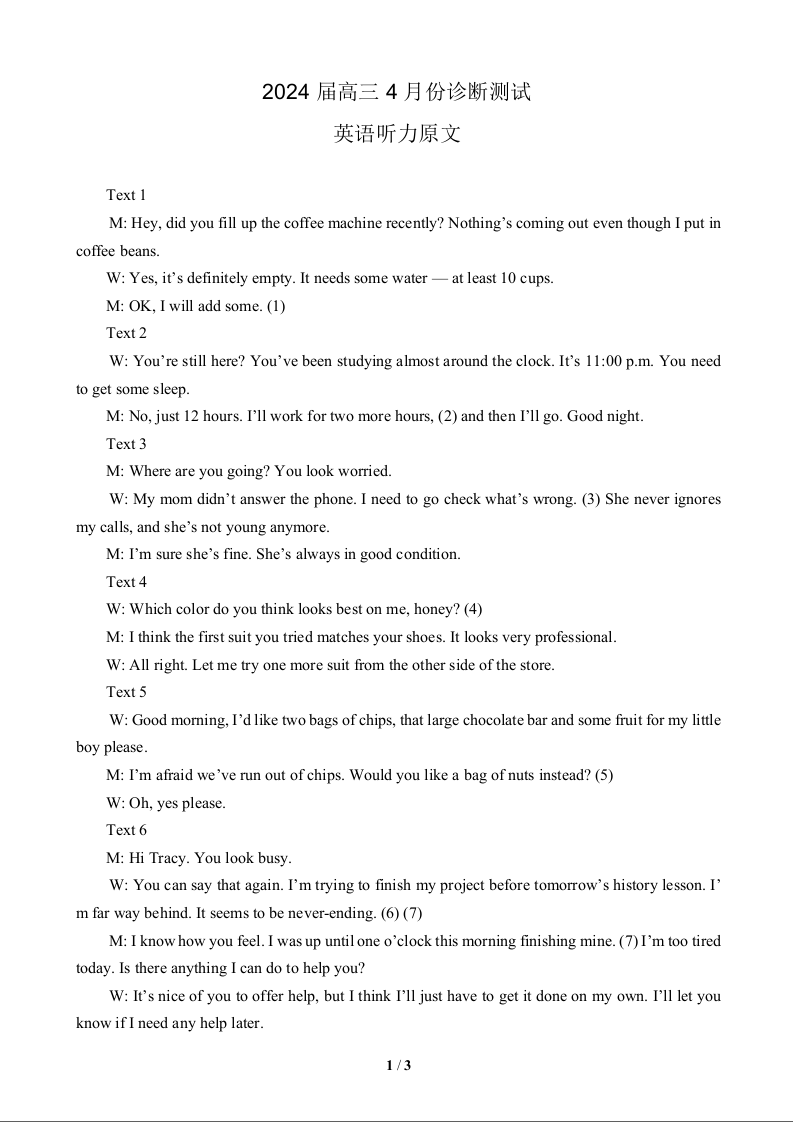江苏省2024届新高考基地学校第五次大联考+英语听力原文