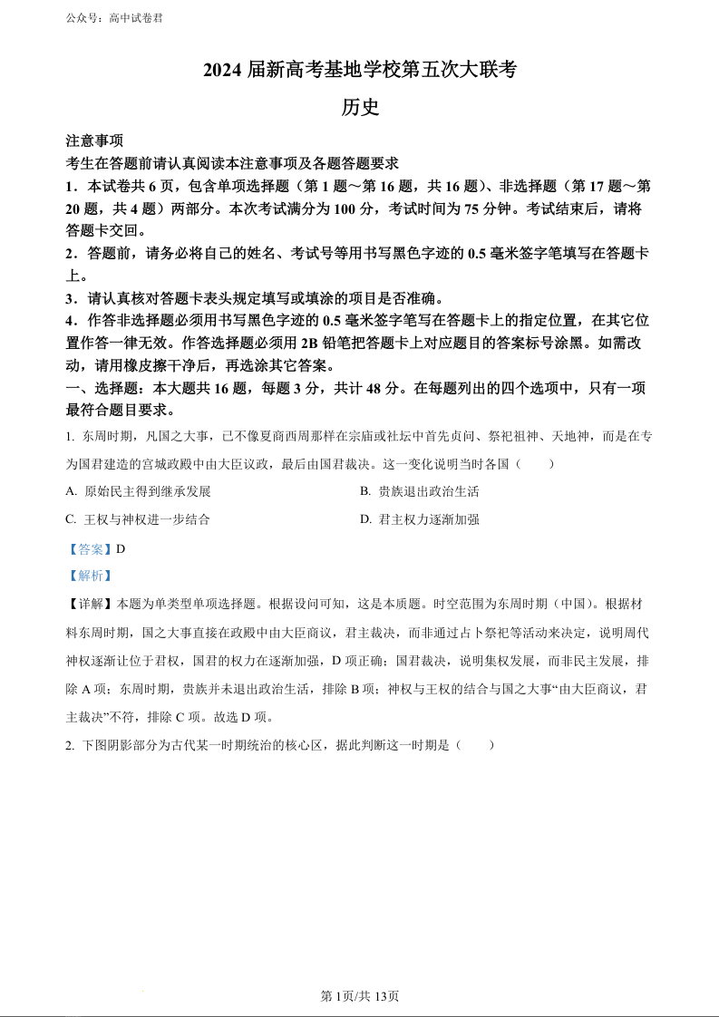江苏省2024届新高考基地学校第五次大联考+历史答案