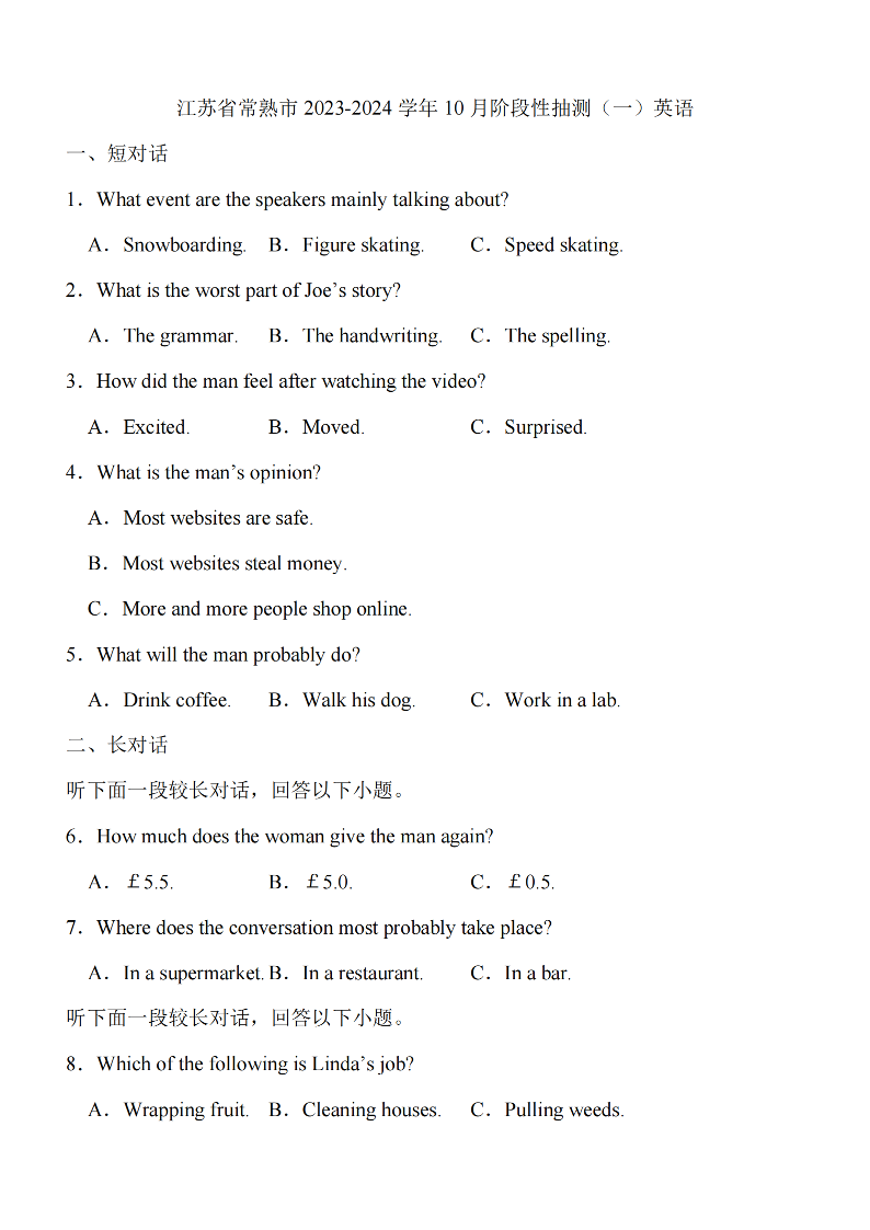 江苏省常熟中学24届高三上阶段性抽测一 英语