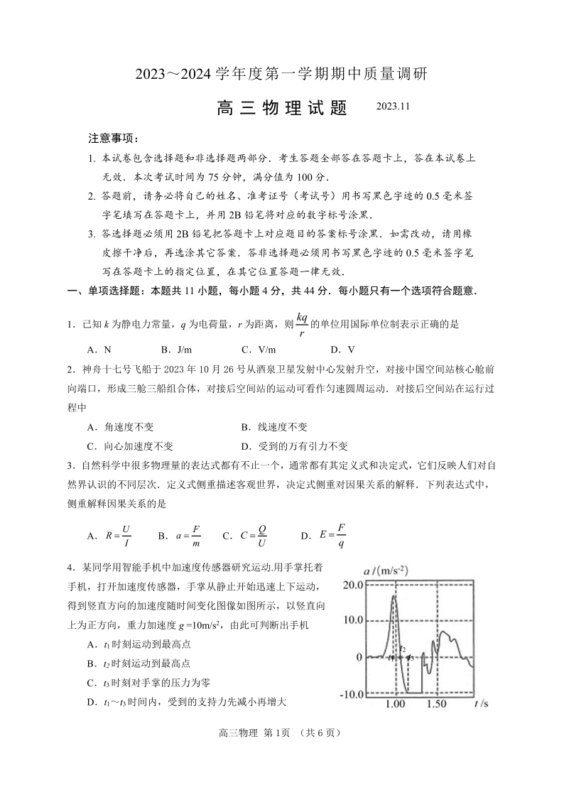 江苏省常州市2023-2024学年高三上学期期中学业水平监测 物理