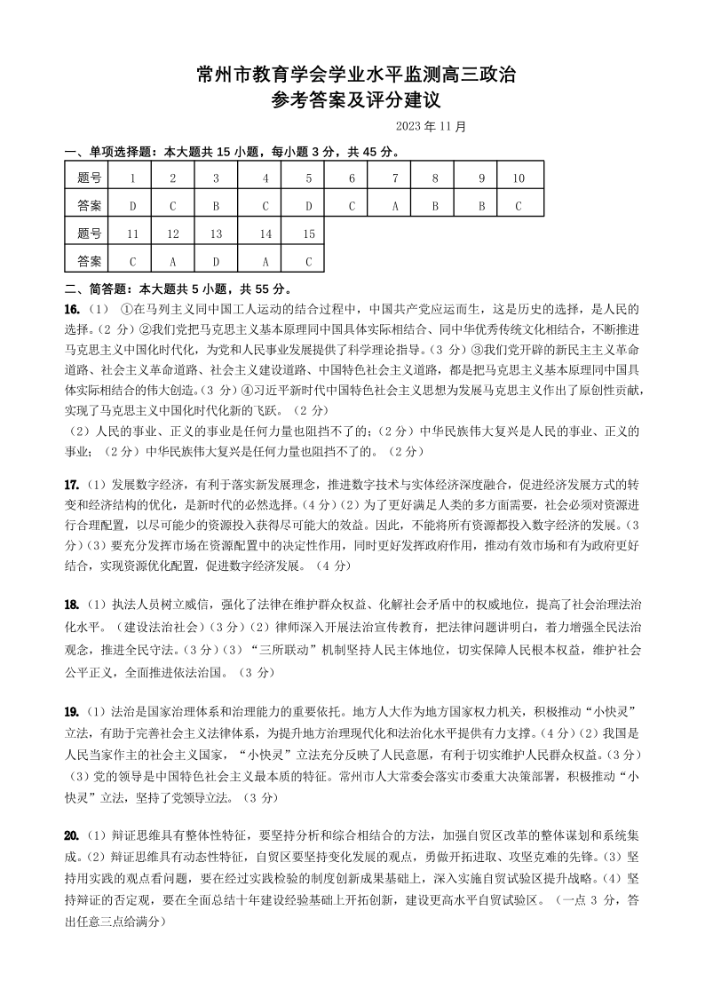 江苏省常州市2023-2024学年高三上学期期中学业水平监测 政治答案