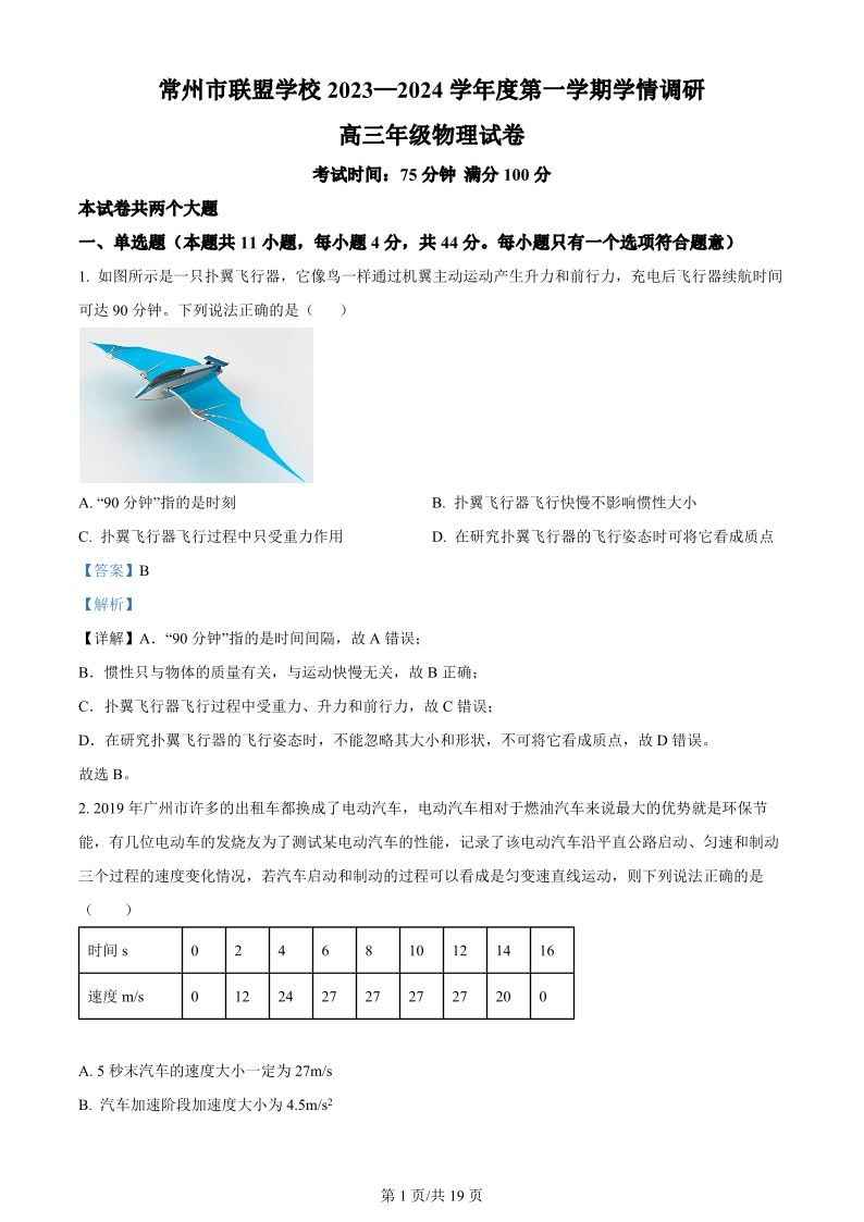 江苏省常州市联盟学校2024届高三上学期10月学情调研 物理答案