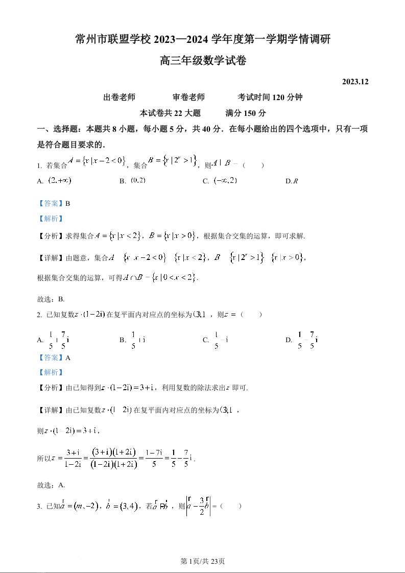 江苏省常州市联盟学校2024届高三上学期12月学情调研 数学答案
