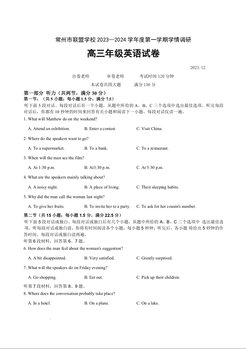 江苏省常州市联盟学校2024届高三上学期12月学情调研 英语