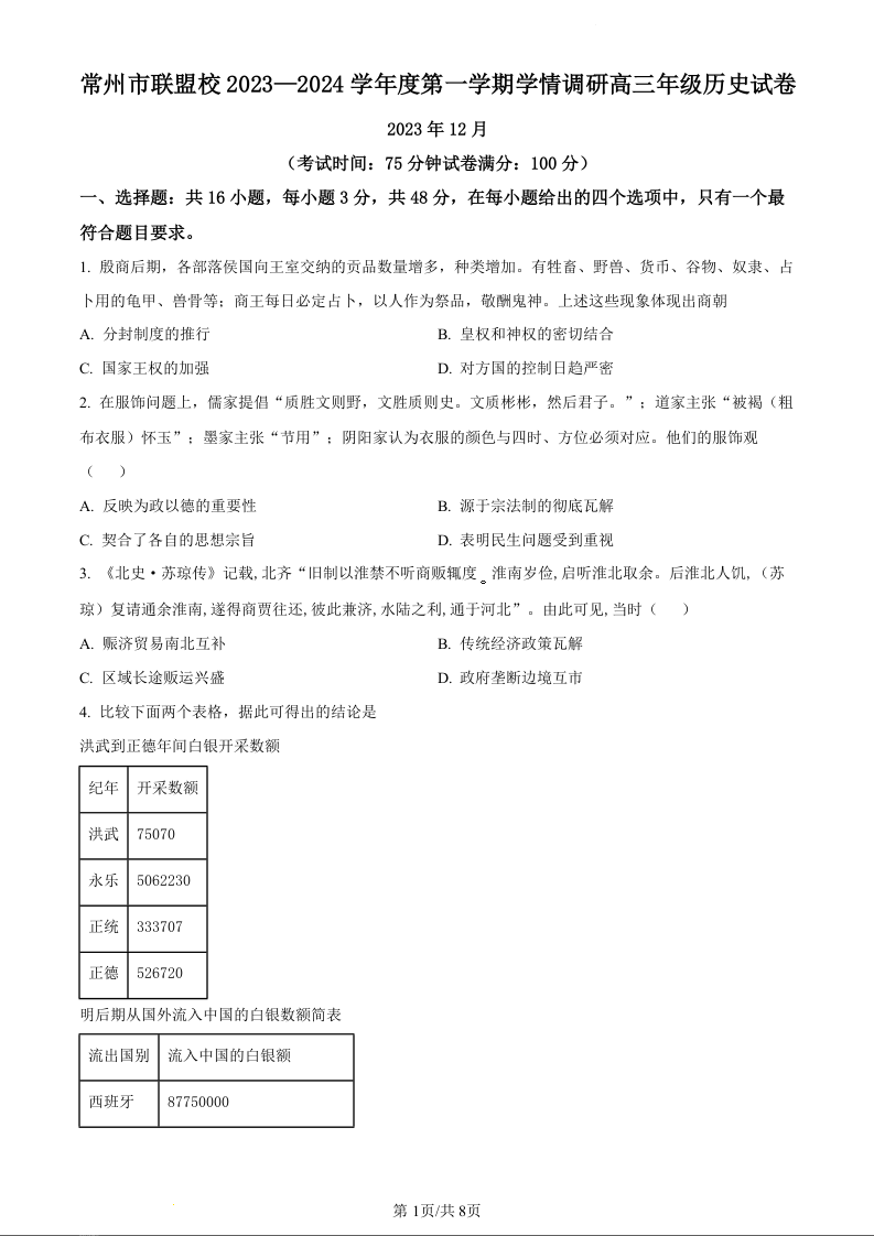 江苏省常州市联盟学校2024届高三上学期12月学情调研 历史