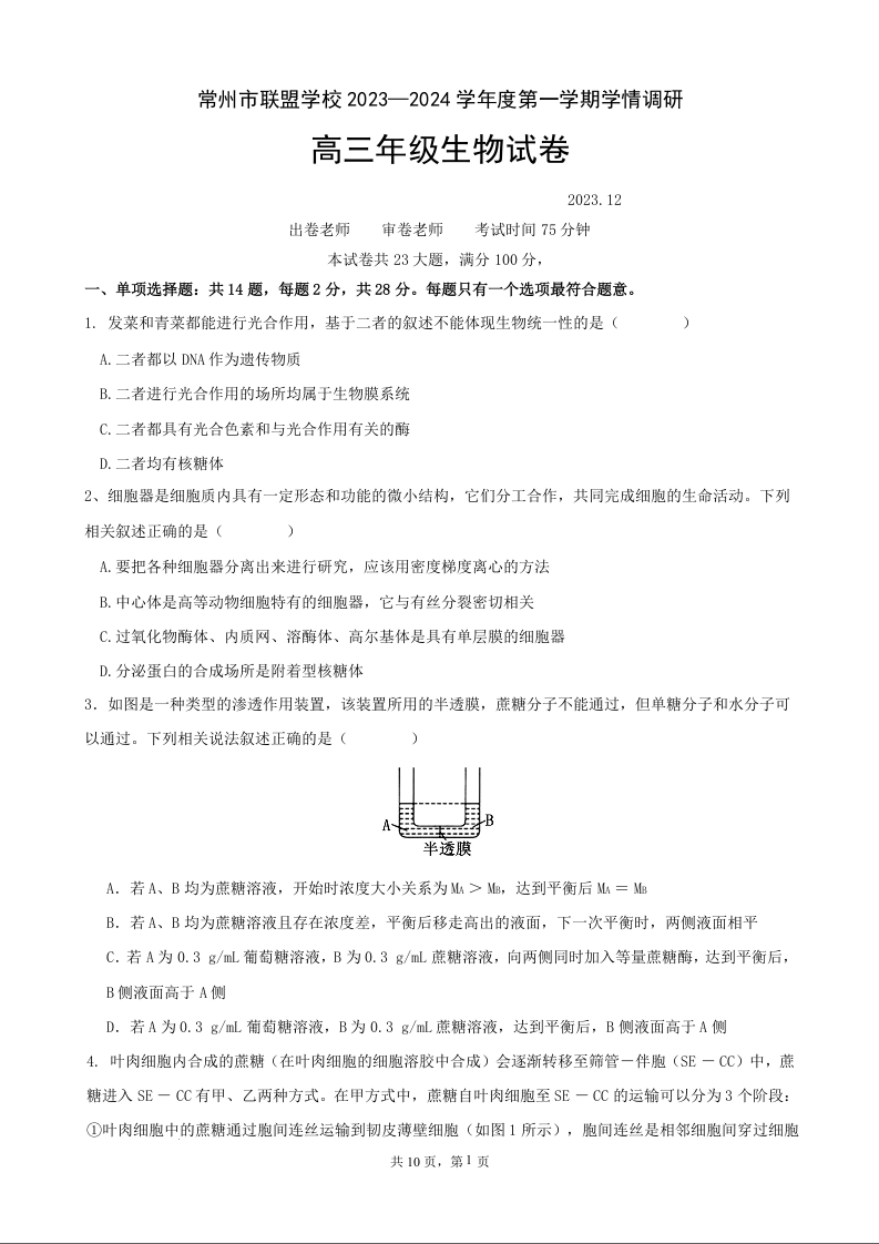 江苏省常州市联盟学校2024届高三上学期12月学情调研 生物