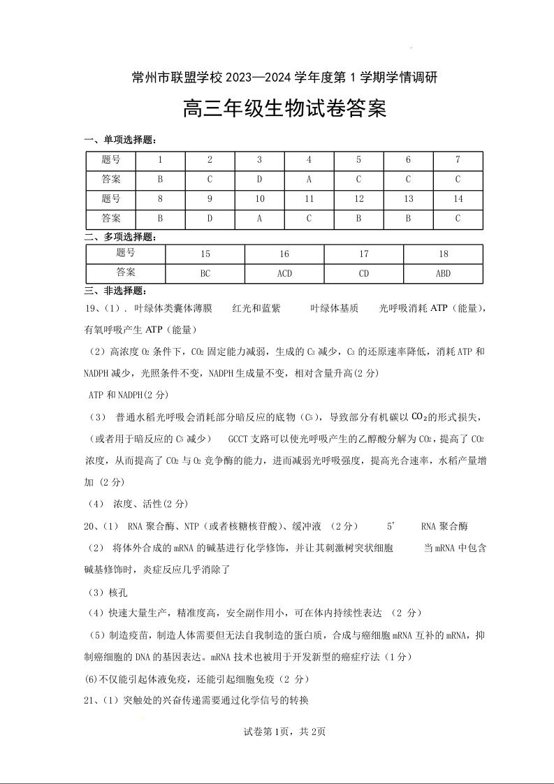 江苏省常州市联盟学校2024届高三上学期12月学情调研 生物答案