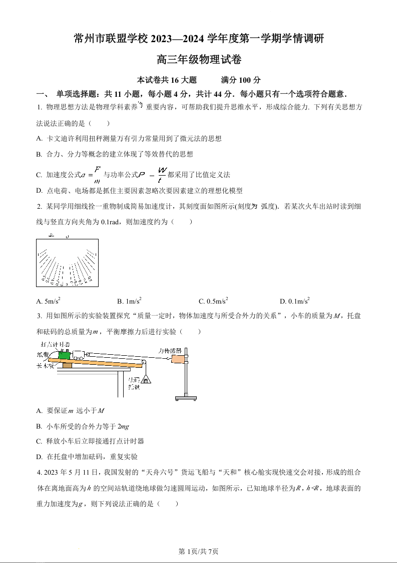 江苏省常州市联盟学校2024届高三上学期12月学情调研 物理