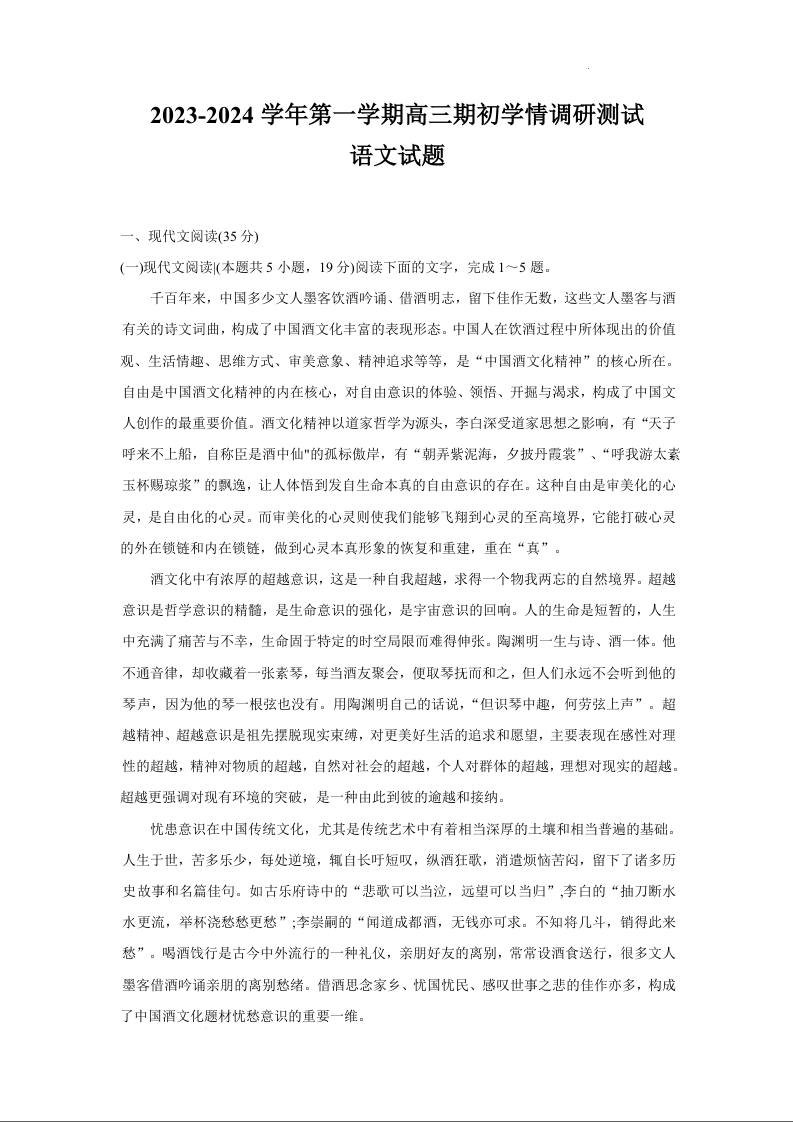 江苏省高邮市2023-2024学年高三上学期期初学情调研测试 语文