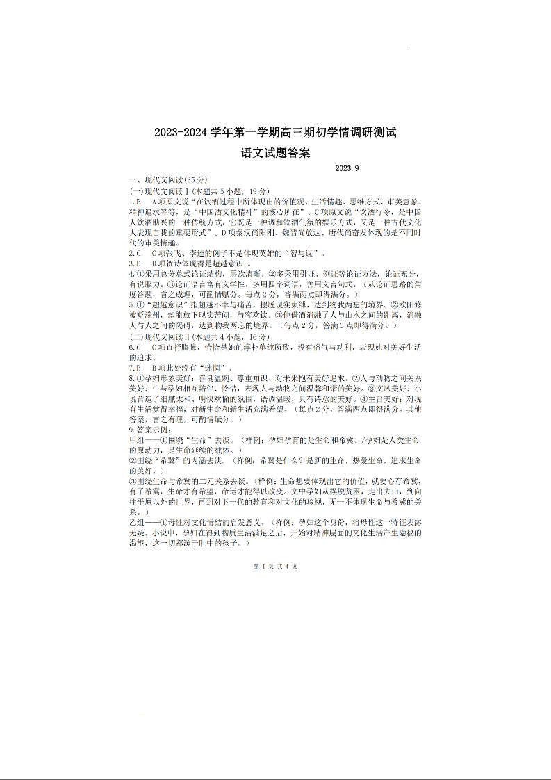 江苏省高邮市2023-2024学年高三上学期期初学情调研测试 语文答案