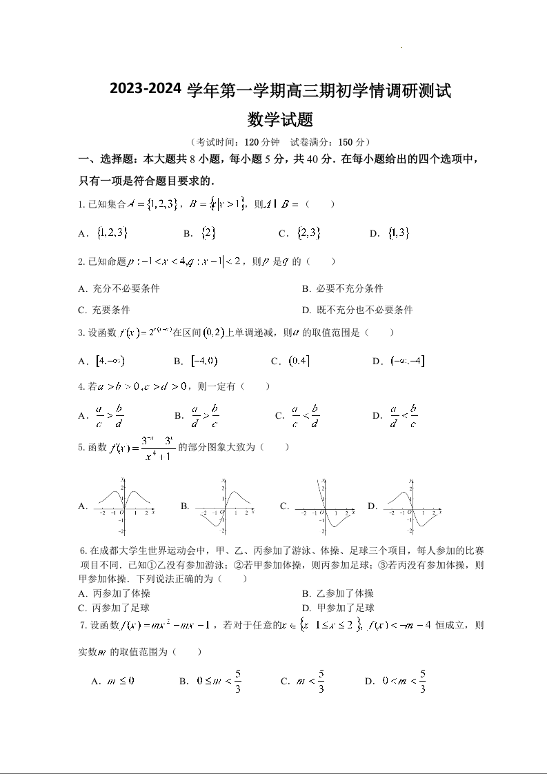 江苏省高邮市2023-2024学年高三上学期期初学情调研测试 数学