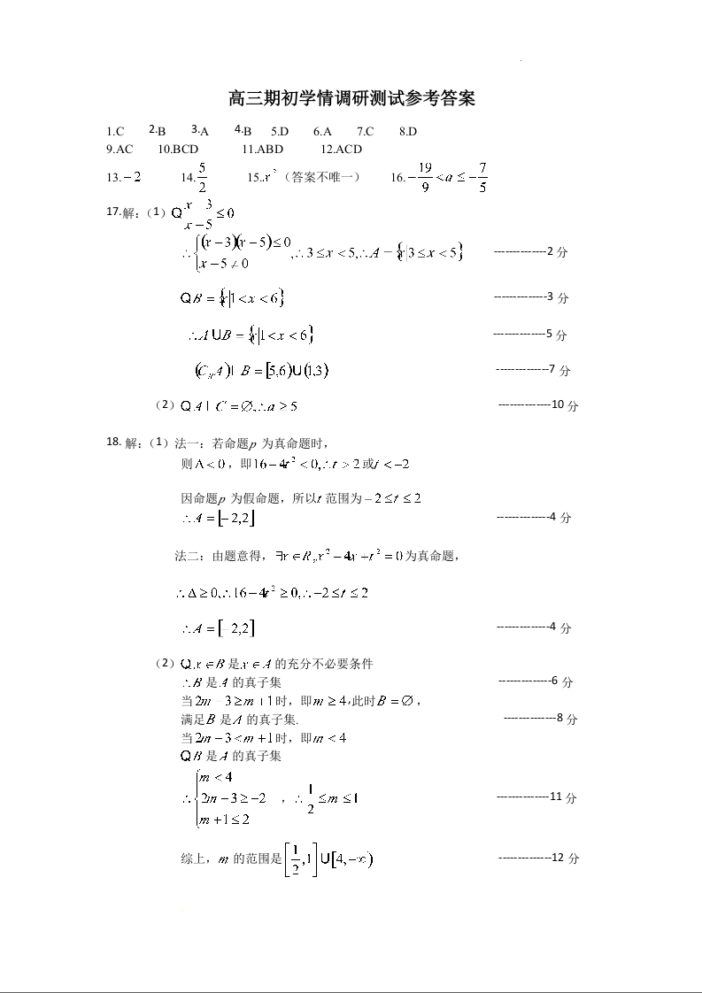 江苏省高邮市2023-2024学年高三上学期期初学情调研测试 数学答案