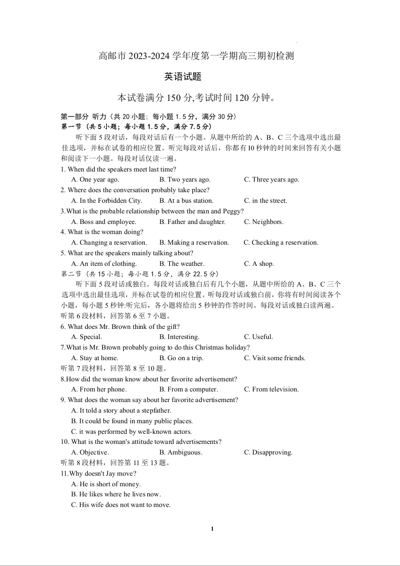 江苏省高邮市2023-2024学年高三上学期期初学情调研测试 英语