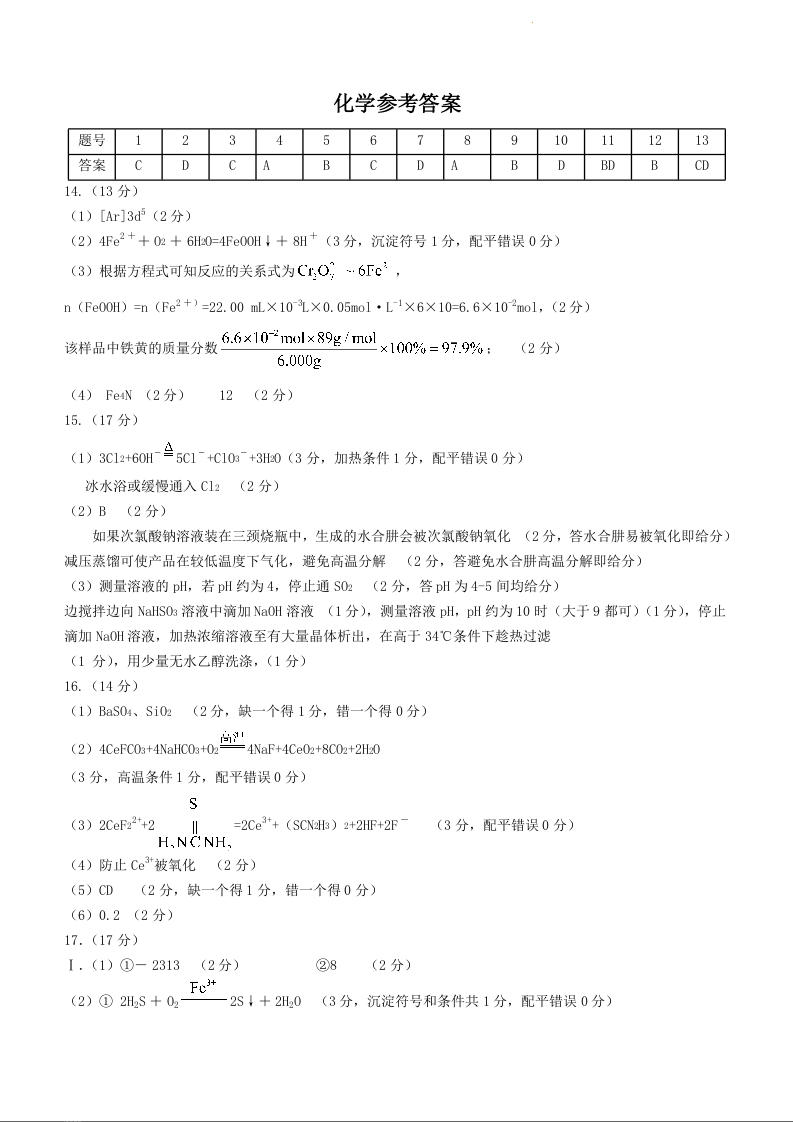 江苏省高邮市2023-2024学年高三上学期期初学情调研测试 化学答案