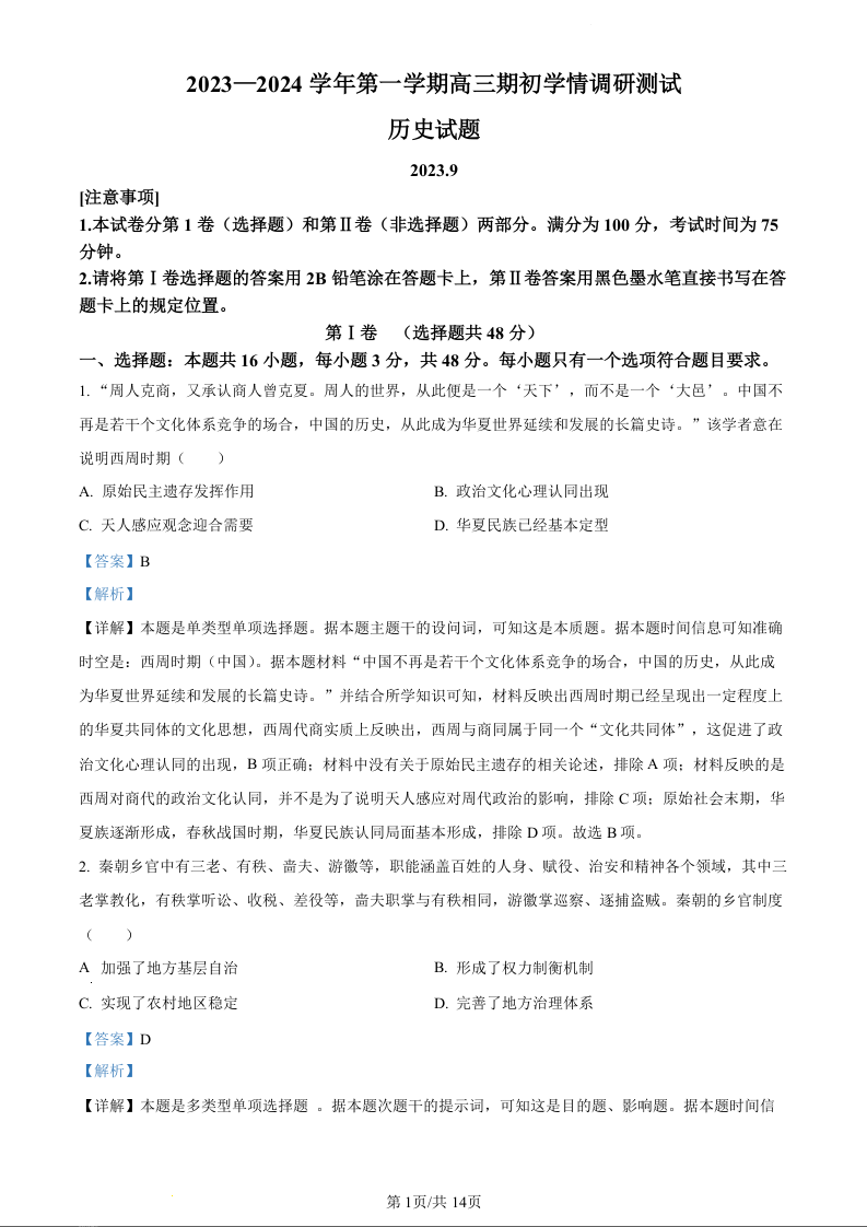 江苏省高邮市2023-2024学年高三上学期期初学情调研测试 历史解析