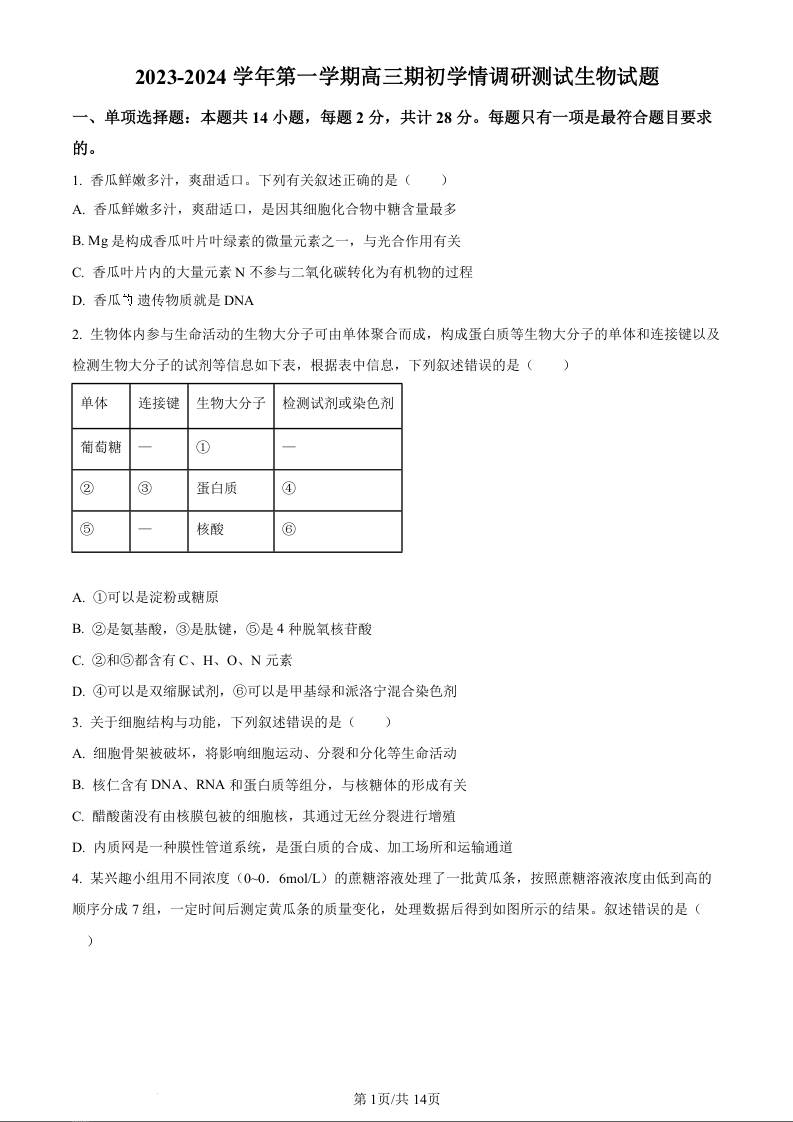江苏省高邮市2023-2024学年高三上学期期初学情调研测试 生物