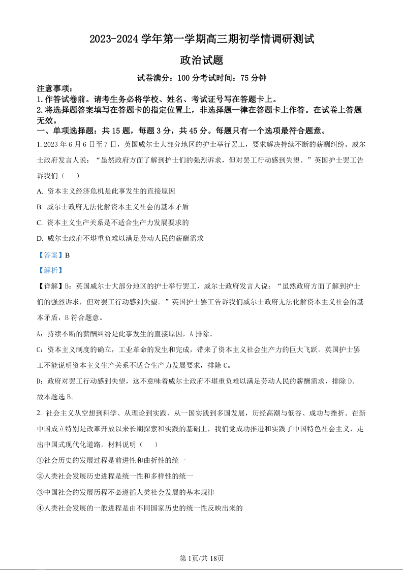 江苏省高邮市2023-2024学年高三上学期期初学情调研测试 政治解析