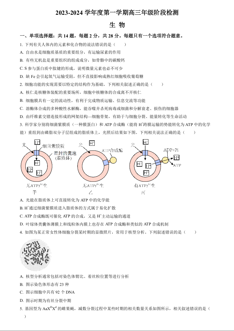 江苏省海安高级中学2023-2024学年高三上学期10月月考试题 生物