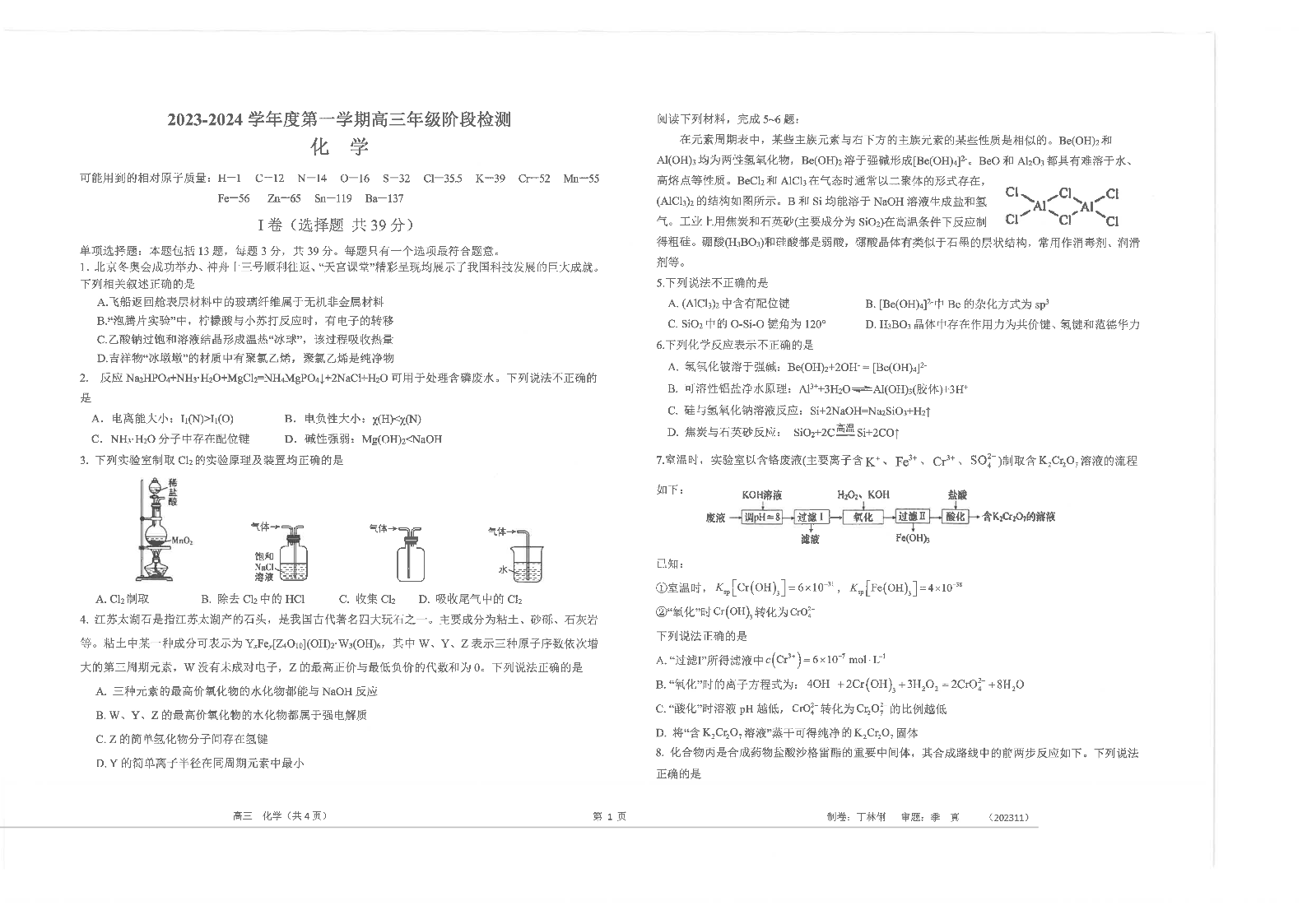 江苏省海安高级中学2023-2024学年高三上学期11月月考试题 化学