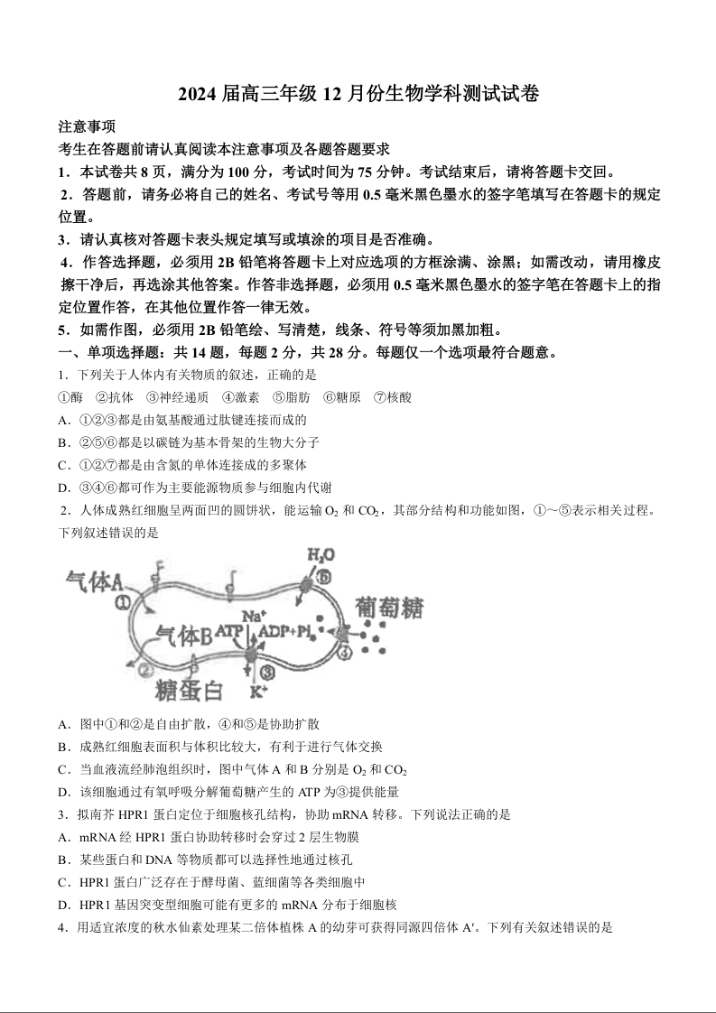 江苏省海安高级中学2023-2024学年高三上学期12月月考试题 生物