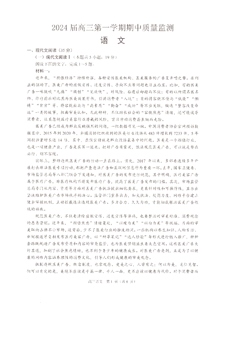 江苏省淮安、南通部分学校2023-2024学年高三上学期11月期中监测 语文