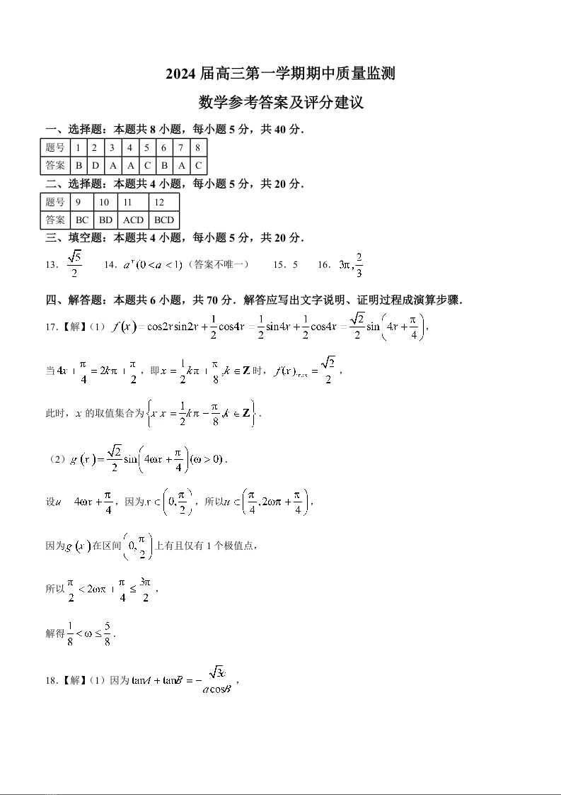 江苏省淮安、南通部分学校2023-2024学年高三上学期11月期中监测 数学答案
