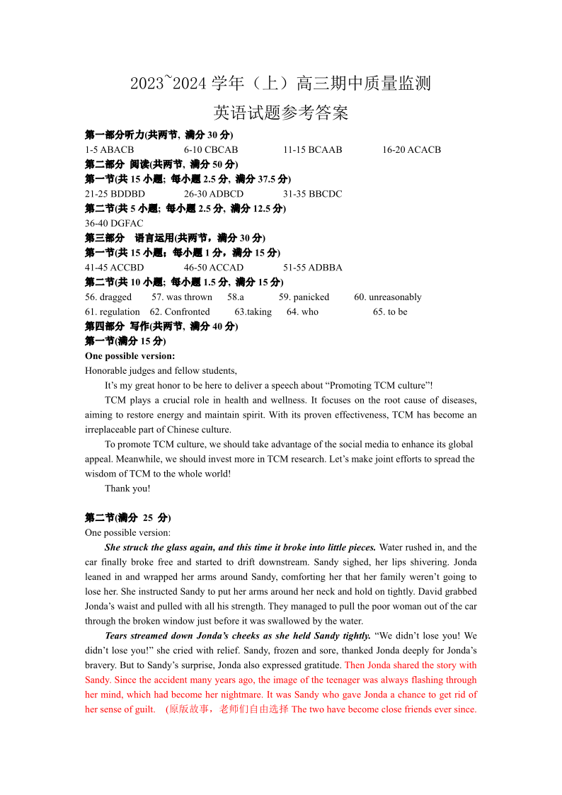 江苏省淮安、南通部分学校2023-2024学年高三上学期11月期中监测 英语答案