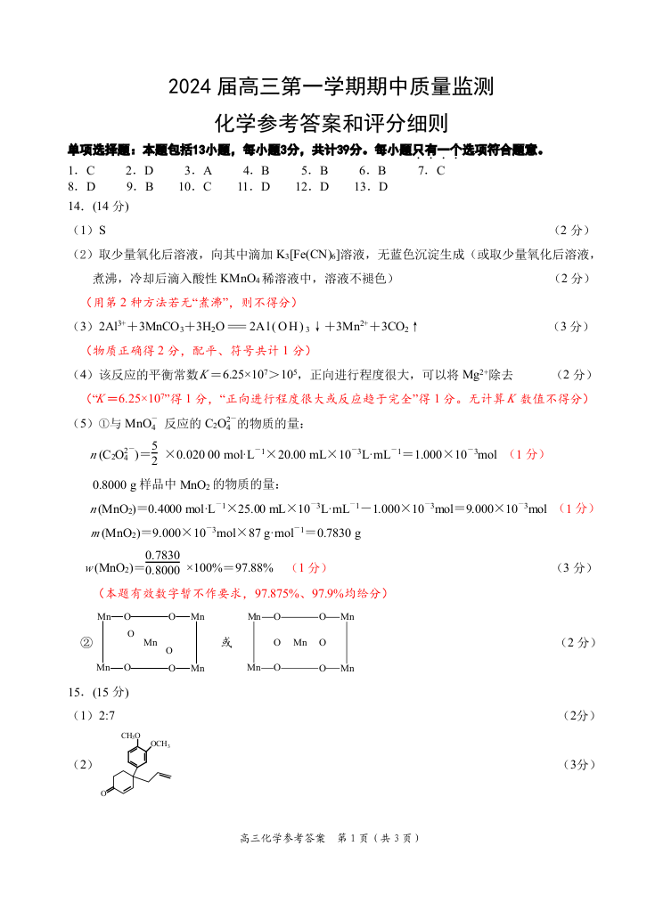 江苏省淮安、南通部分学校2023-2024学年高三上学期11月期中监测 化学答案