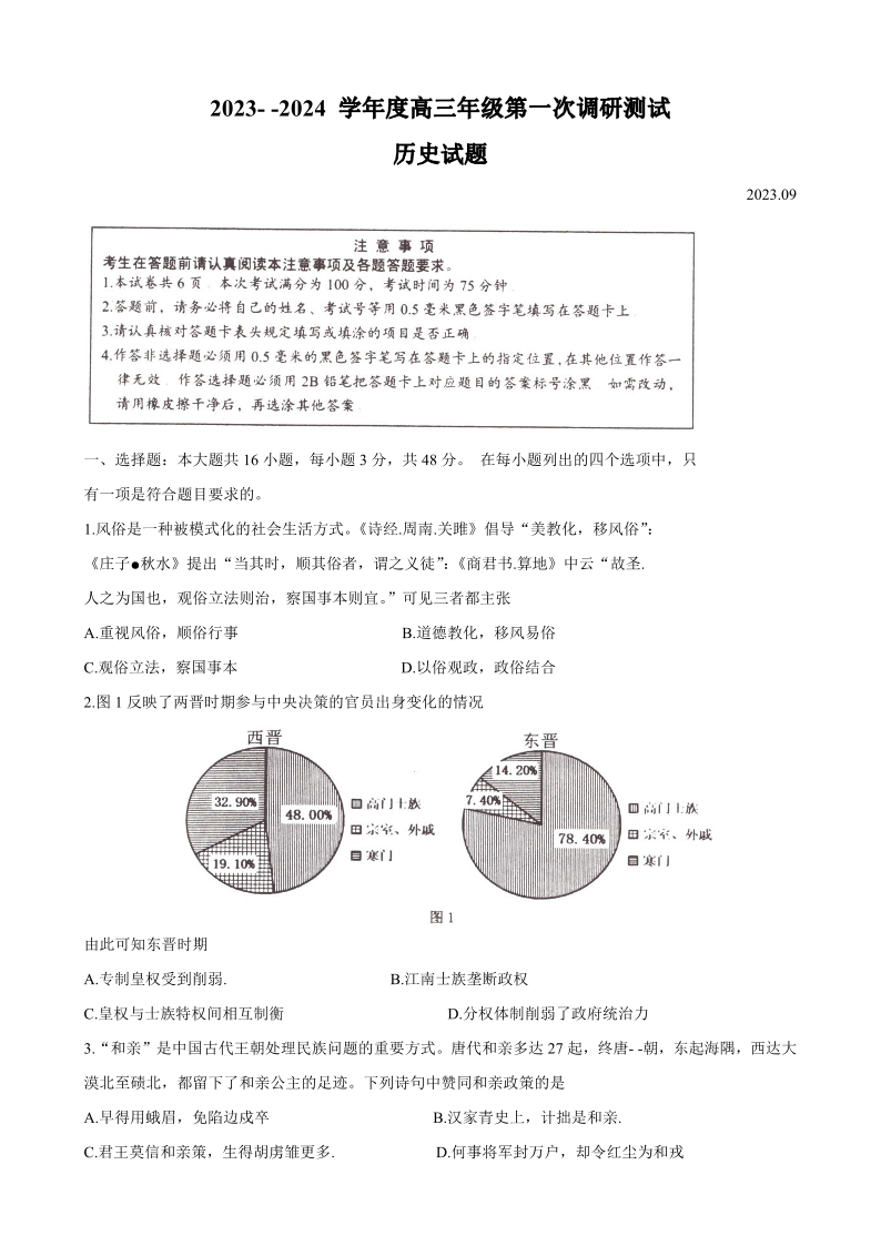 江苏省淮安市2023-2024学年度高三年级第一次调研测试 历史