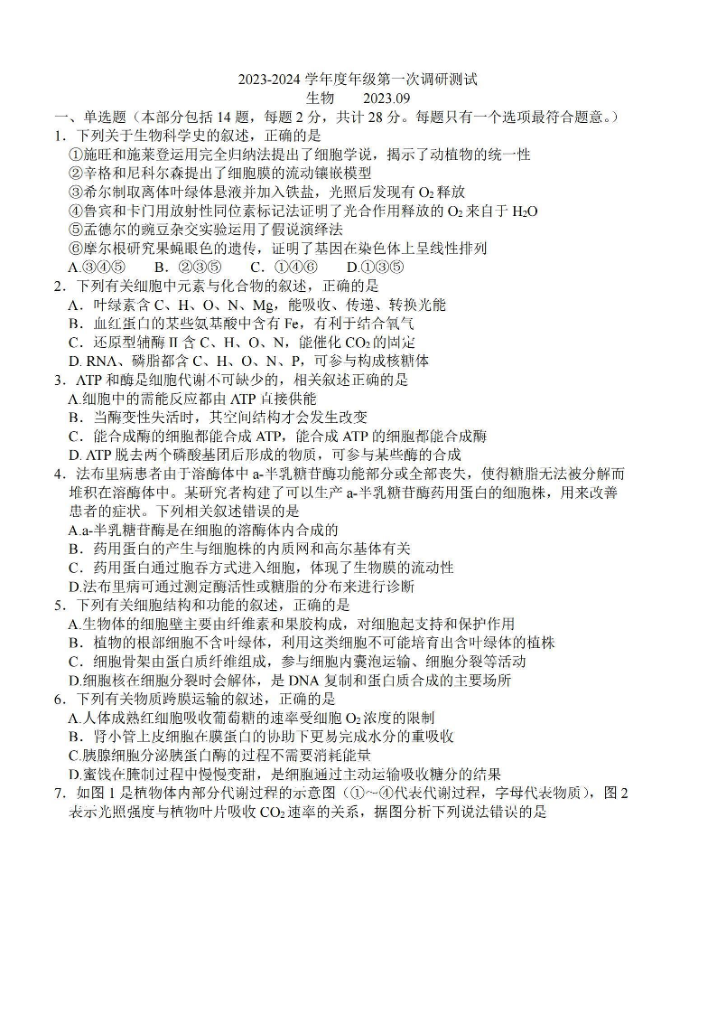 江苏省淮安市2023-2024学年度高三年级第一次调研测试 生物
