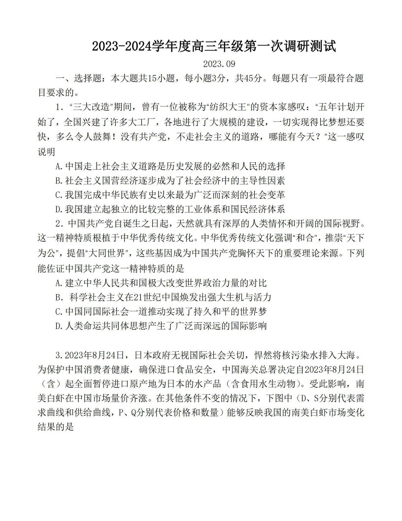 江苏省淮安市2023-2024学年度高三年级第一次调研测试 政治