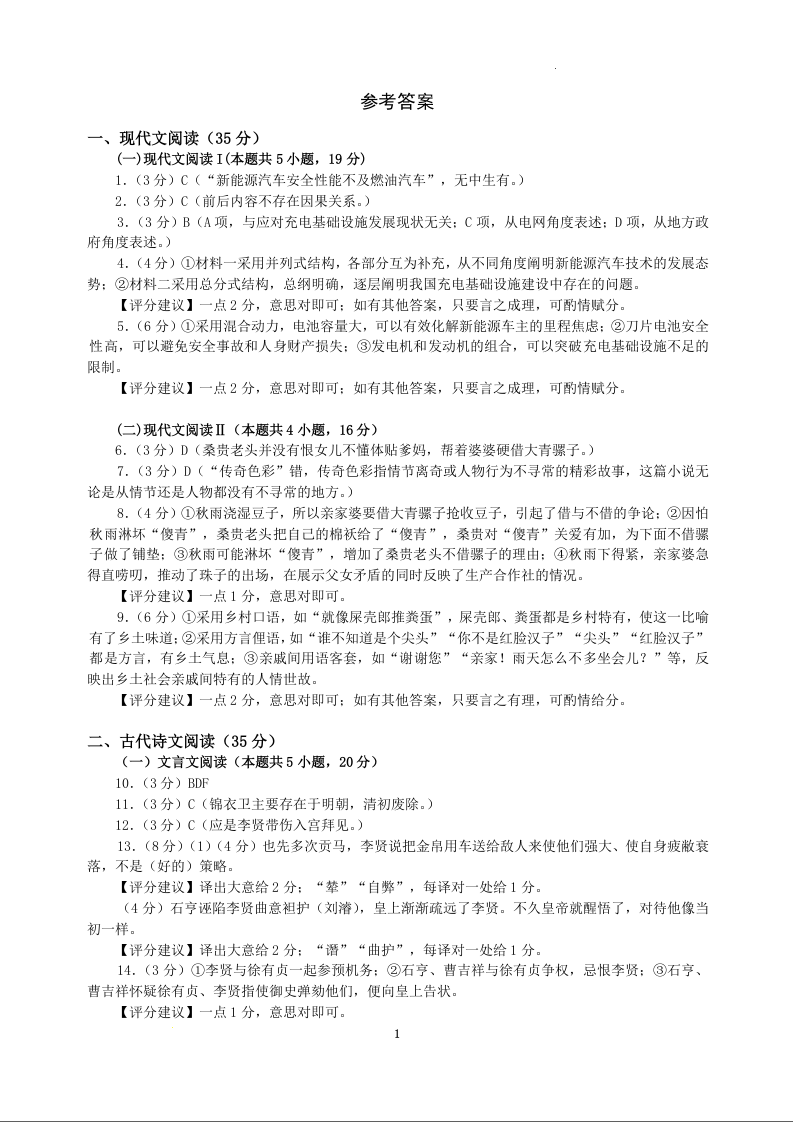 江苏省淮安市高中校协作体2023-2024学年高三上学期期中联考 语文答案