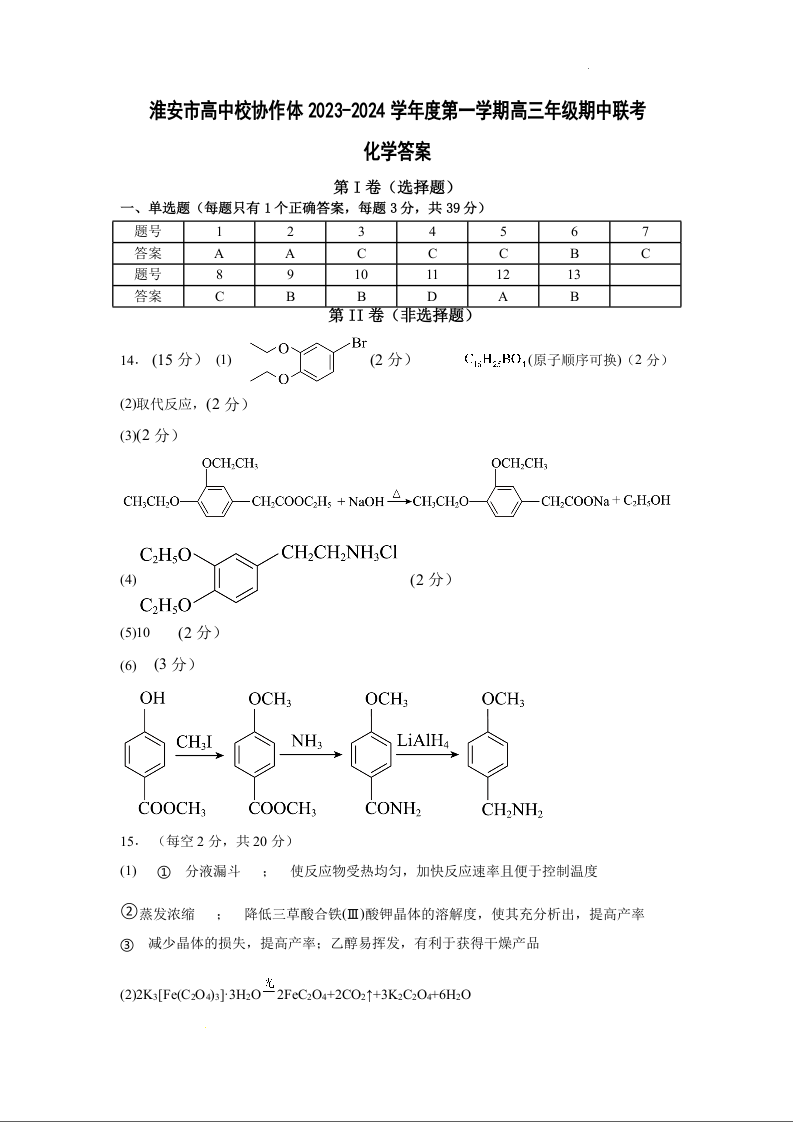 江苏省淮安市高中校协作体2023-2024学年高三上学期期中联考 化学答案