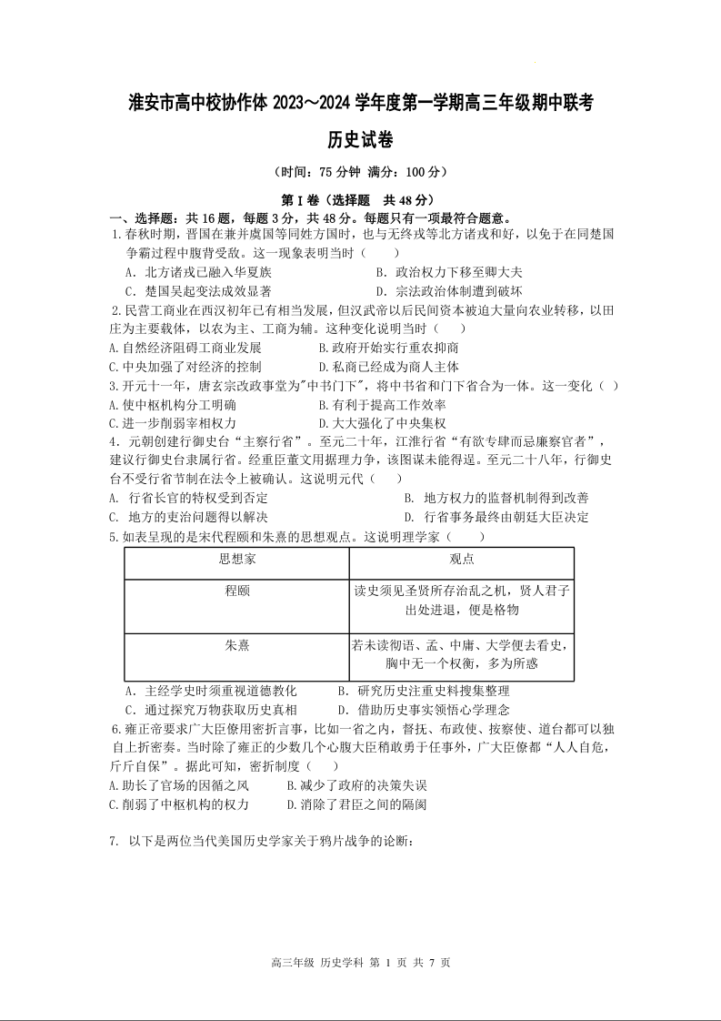 江苏省淮安市高中校协作体2023-2024学年高三上学期期中联考 历史