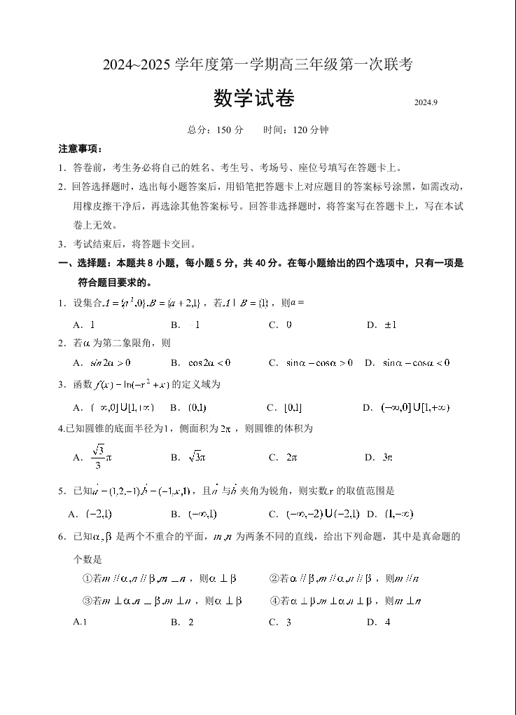 江苏省淮安市十校2024-2025学年高三上学期第一次联考+数学