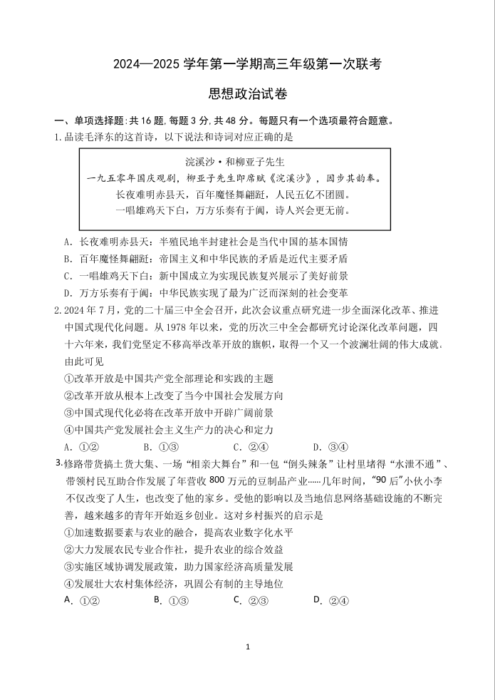 江苏省淮安市十校2024-2025学年高三上学期第一次联考+政治