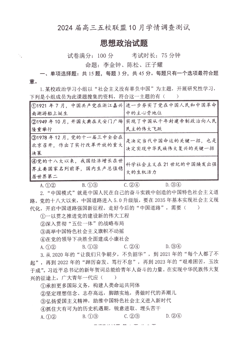 江苏省淮安市五校联盟2023-2024学年高三上学期10月学情调查测试 政治