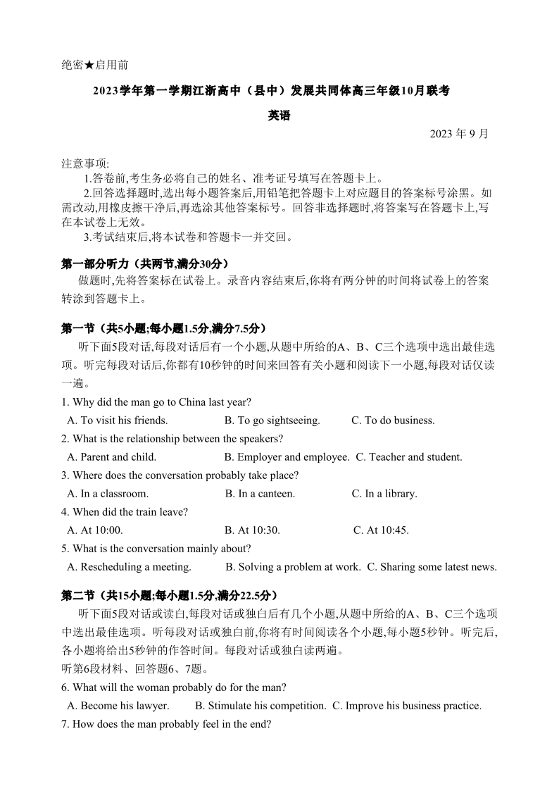 江苏省江浙高中发展共同体2023-2024学年高三上学期10月联考 英语