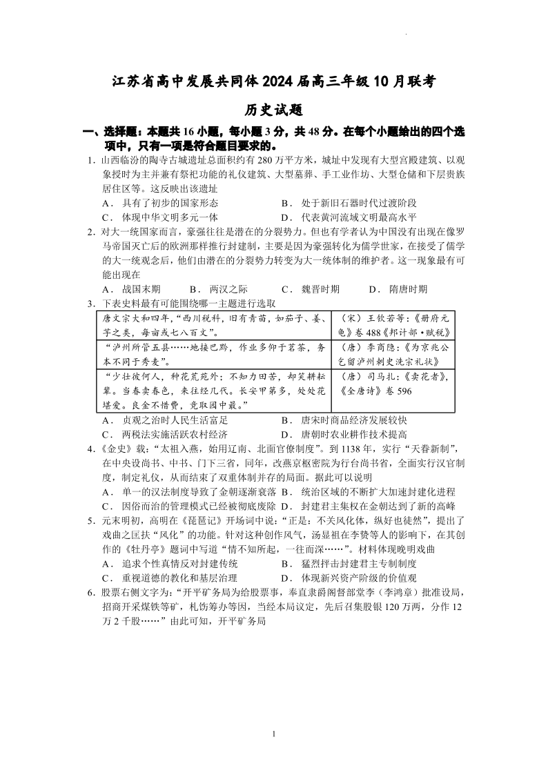 江苏省江浙高中发展共同体2023-2024学年高三上学期10月联考 历史