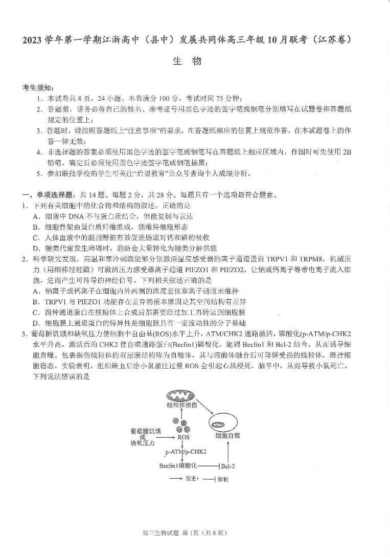 江苏省江浙高中发展共同体2023-2024学年高三上学期10月联考 生物