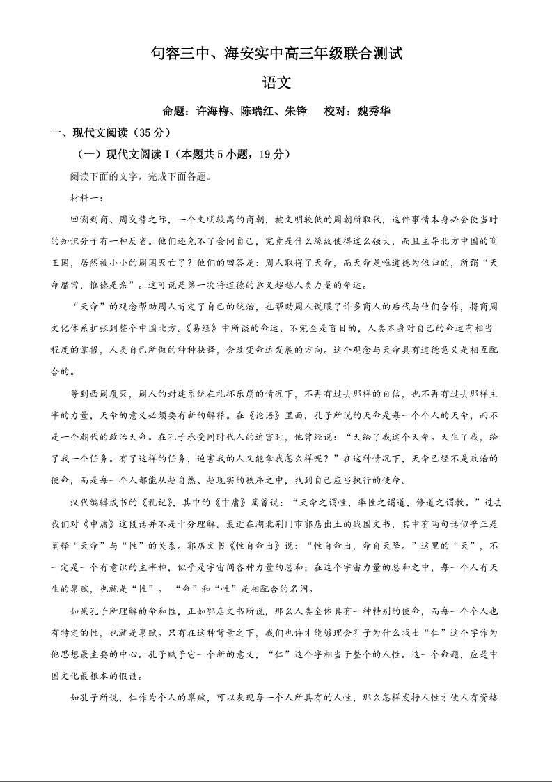 江苏省句容市第三中学、海安实验中学2023-2024学年高三上学期10月联考 语文