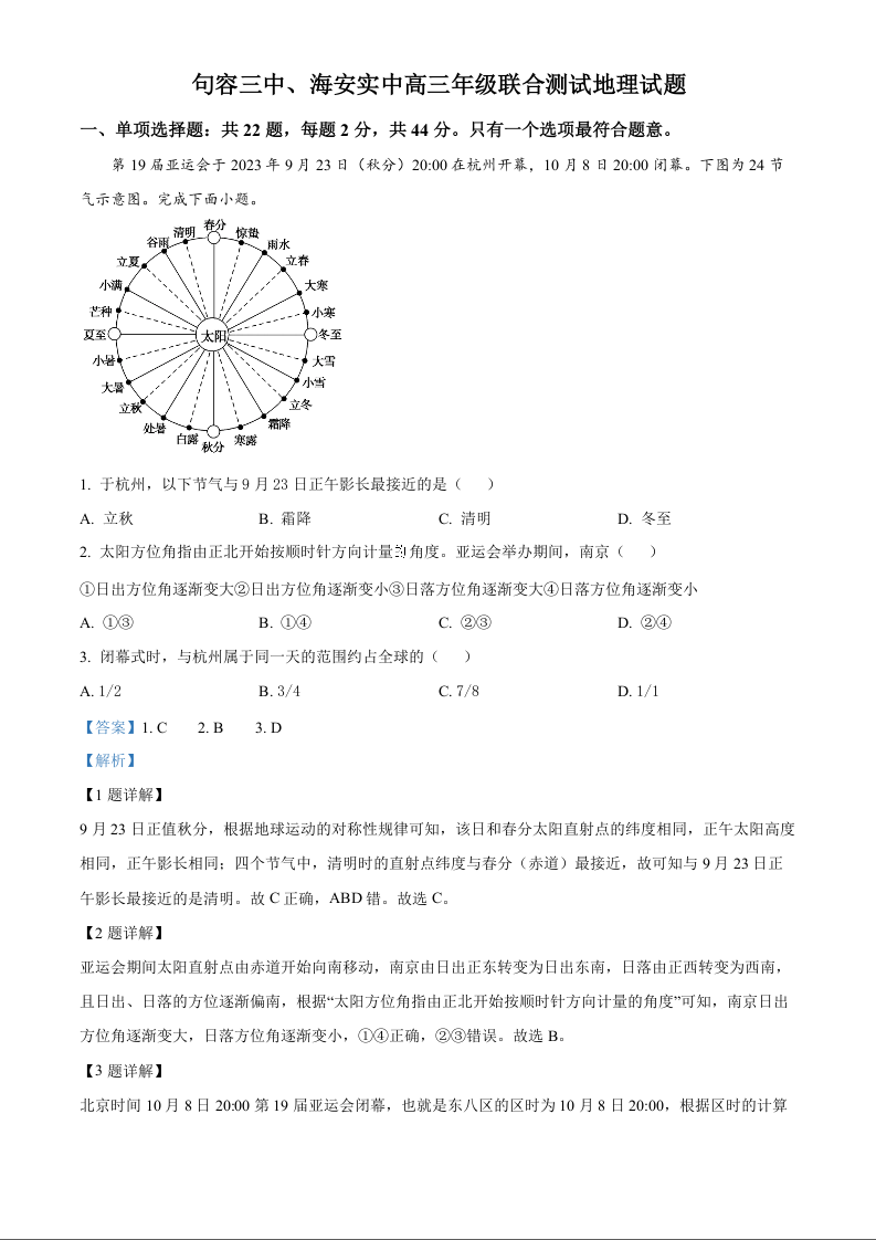 江苏省句容市第三中学、海安实验中学2023-2024学年高三上学期10月联考 地理答案