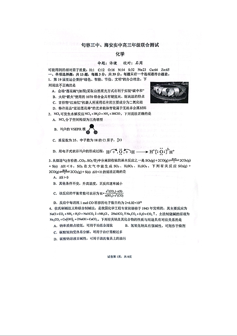 江苏省句容市第三中学、海安实验中学2023-2024学年高三上学期10月联考 化学