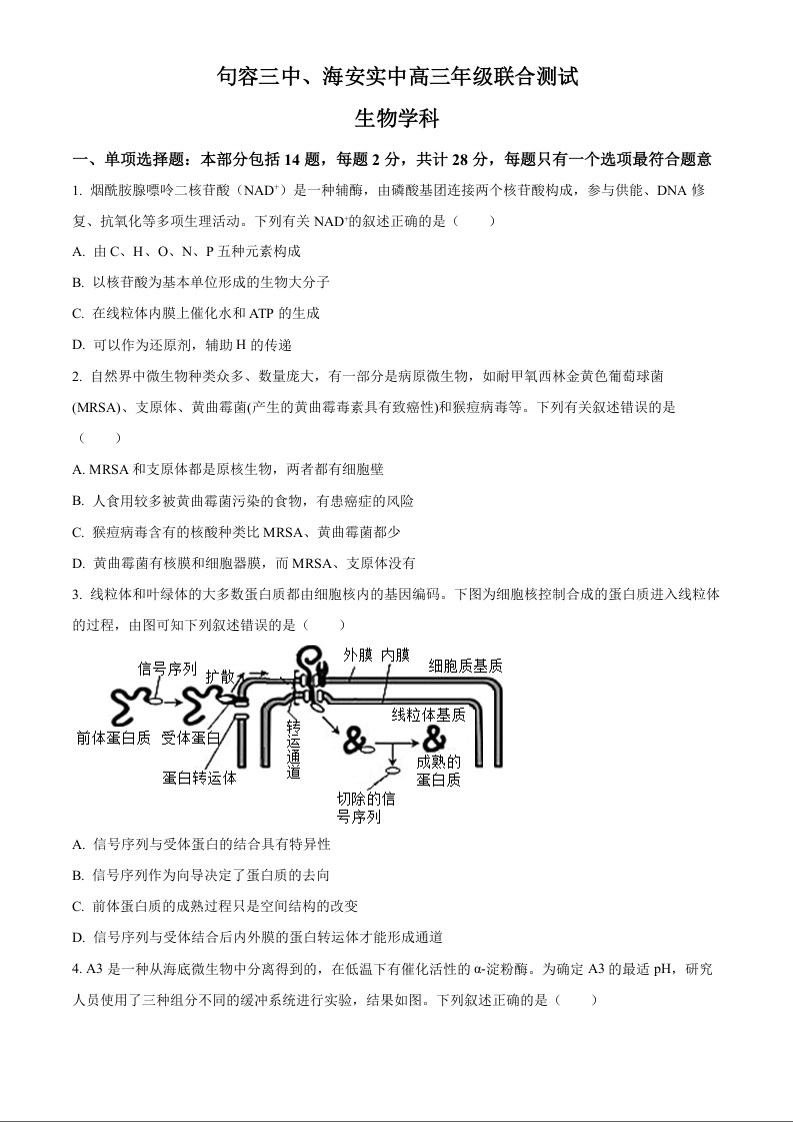 江苏省句容市第三中学、海安实验中学2023-2024学年高三上学期10月联考 生物