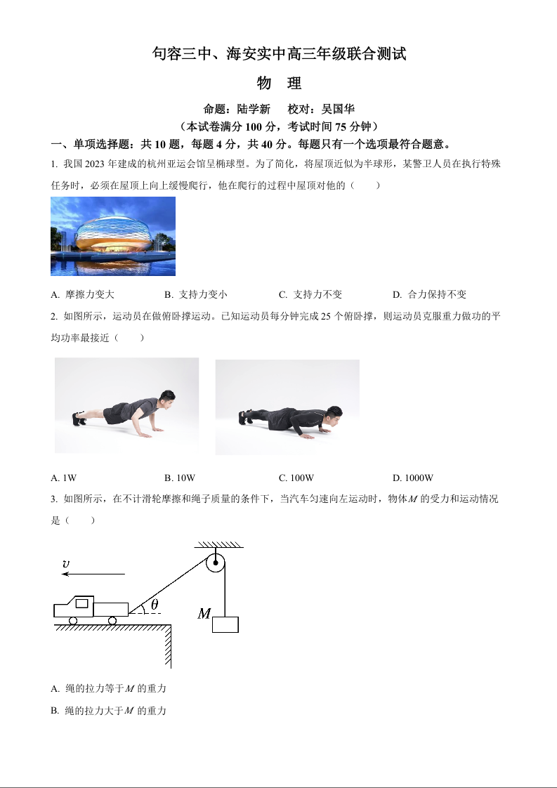 江苏省句容市第三中学、海安实验中学2023-2024学年高三上学期10月联考 物理